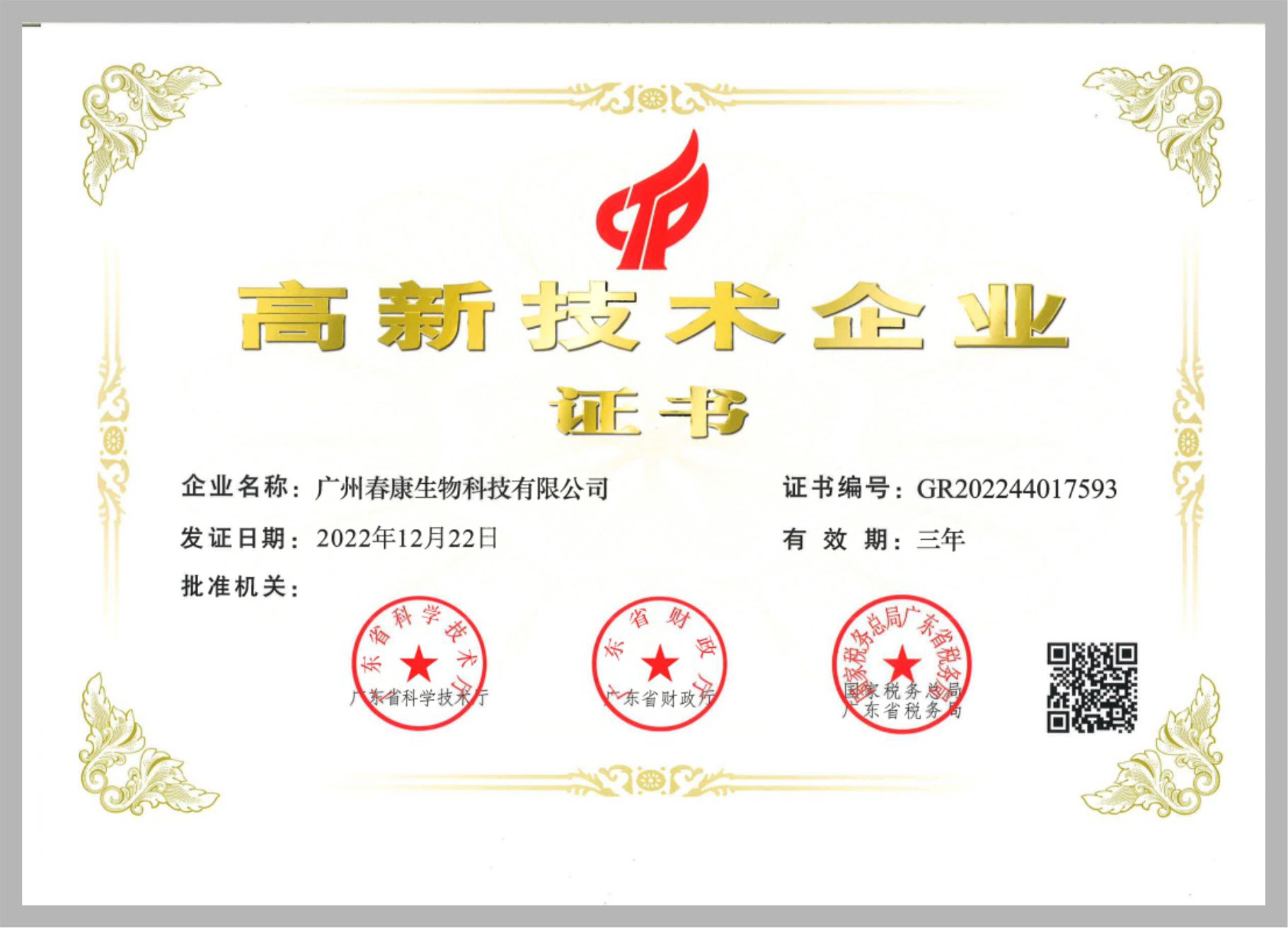 热烈祝贺春康生物获得“高新技术企业”殊荣!