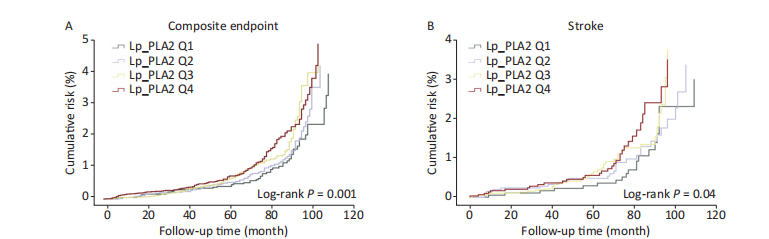 随着Lp-PLA2四分位数的增加,心血管事件的累积风险,包括复合终点、卒中、MACE和全因死亡,在中位随访期间显著增加。